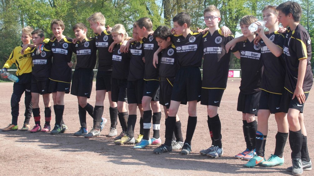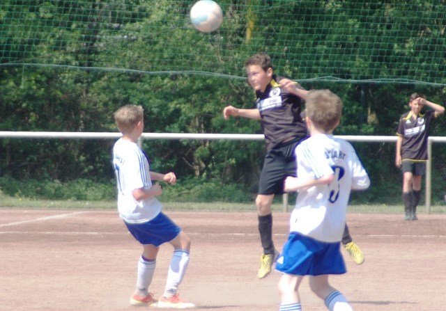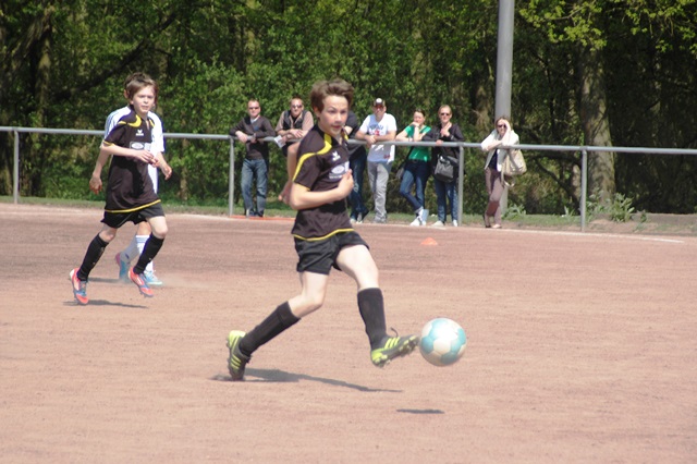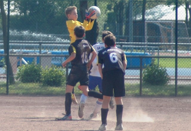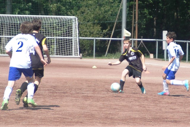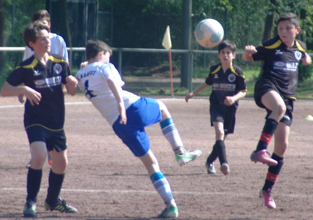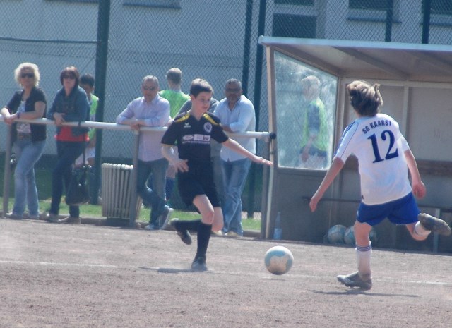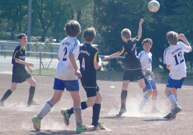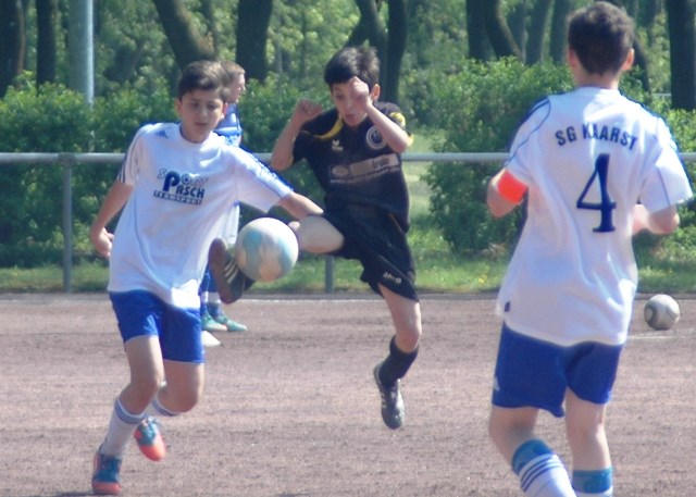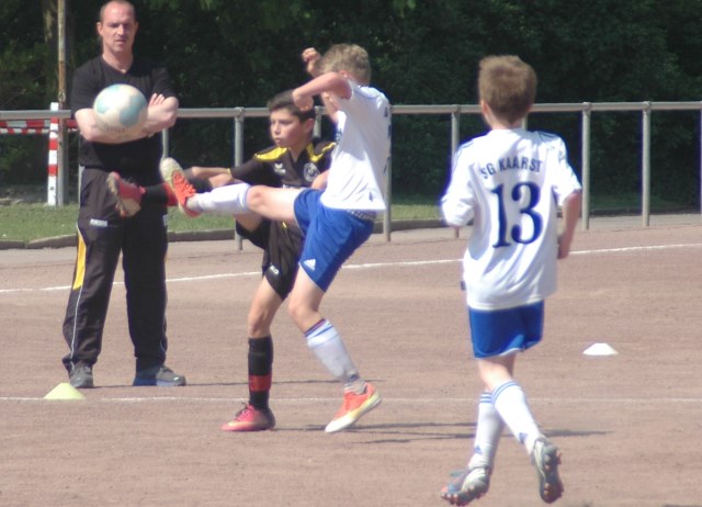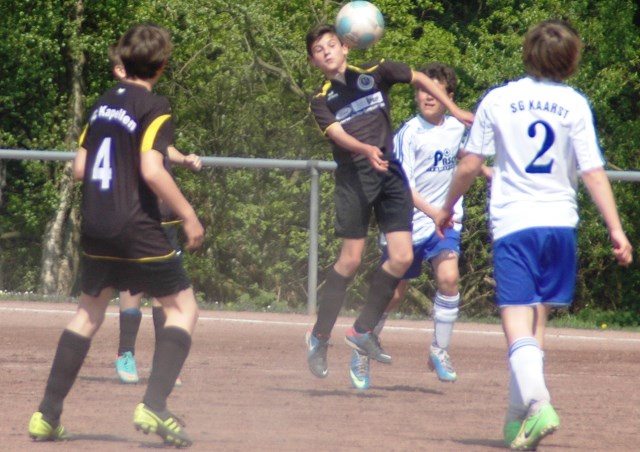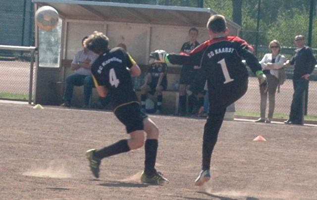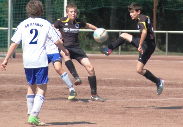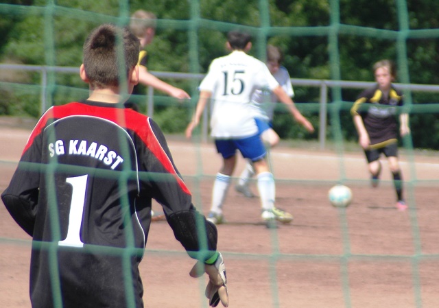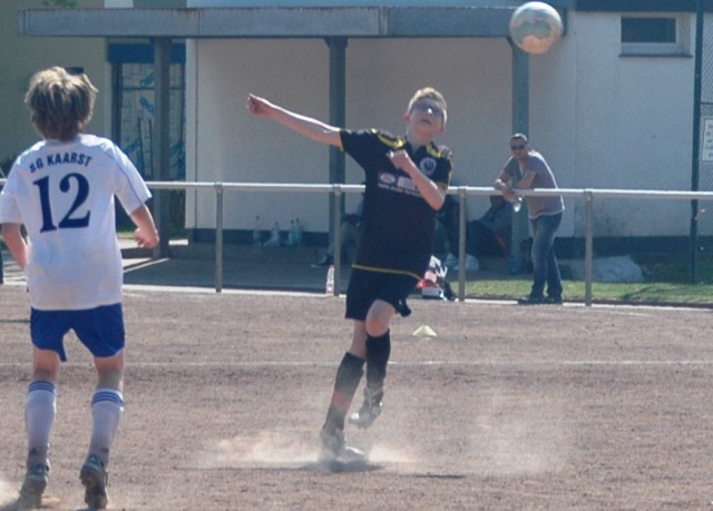 Am heutigen Samstag musste unsere D1 bei der SG Kaarst antreten. Wie schon der Spitzenreiter TuS Grevenbroich zwei Wochen vorher so seine Mühen mit den Kaarstern hatte und nur knapp 3 zu 2 gewann, so taten sich auch unsere Spieler als Tabellenzweiter lange sehr schwer mit der lauffreudigen und robusten Mannschaft auf einem heute sehr staubigen Aschenplatz. Von Anfang an war unser Team zwar immer dominat und versuchte Druck aufzubauen, aber die Kaarster stellten geschickt die Räume zu und erlaubten wenig ansehnliches und Gefahr bringendes Kombinationsspiel. Die Chancen für die Unseren entstanden daher meist nur nach Abwehrfehlern der Kaarster oder durch starke Einzelaktionen. So schaltete Cedric in der 7. Minute schnell und ging in das Passspiel der Kaarster Abwehr, aber sein Schuss ging knapp links am Tor vorbei. Auch Michael hatte kein Glück, als er ein Rückspiel erlief und versuchte, den Ball über den Torwart zu lupfen. Einen gewaltigen Schuss aus etwa 20 Metern Entfernung von Geburtstagskind Kolja lenkte der Torwart nur mit größter Mühe mit einer Hand zur Ecke und nach einem mal schnell gespielten Angriff über links von Niklas schoss Baran nur in die Arme des Torwartes. Hätte Baran ein paar Minuten vorher vielleicht auf einen der beiden mitgelaufenen und frei stehenden Mitspieler gepasst, anstatt es selber zu versuchen, vielleicht wäre man dann doch mit einer Führung in die Halbzeitpause gegangen. So aber stand es nach 30 Minuten nur 0 zu 0 unentschieden, das aber auch unser Torwart Lukas festgehalten hat, denn die Kaarster hatten gerade in der Anfangsphase die große Möglichkeit in Führung zu gehen. Lukas allerdings konnte diese aber durch eine Parade mit dem rechten Knie gerade noch vereiteln. Auch später überzeugte er durch gutes Stellungsspiel, wie zum Beispiel bei einem langen Ball, als er aus dem eigenen Strafraum herauslief und vor einem Kaarster Stürmer mit dem Kopf klärte.