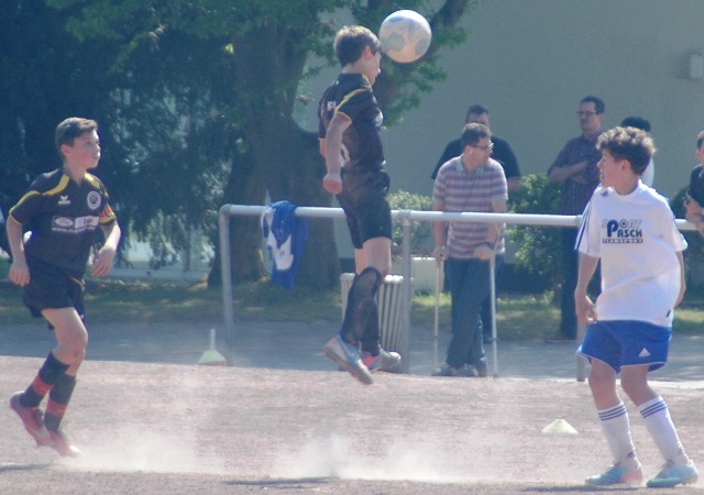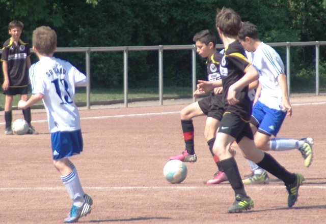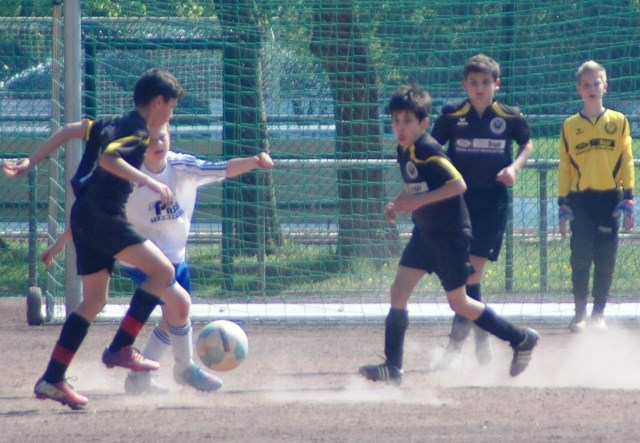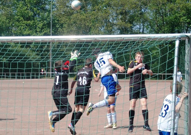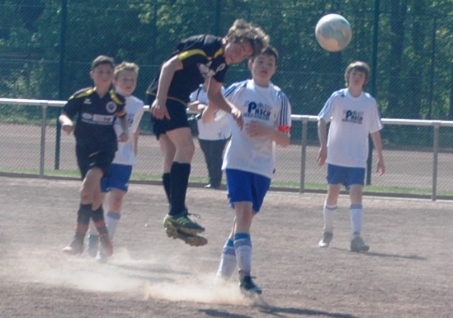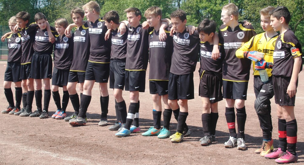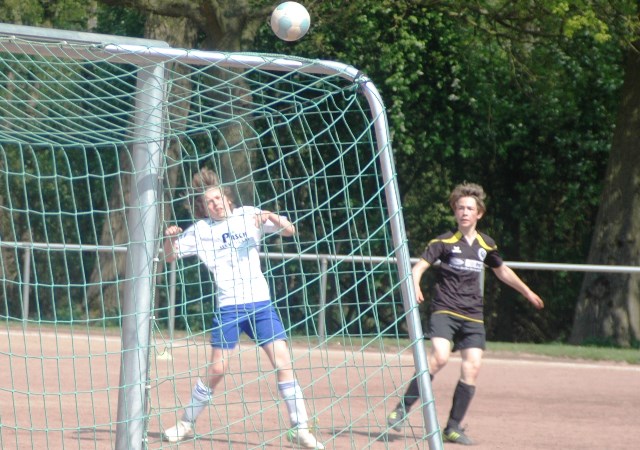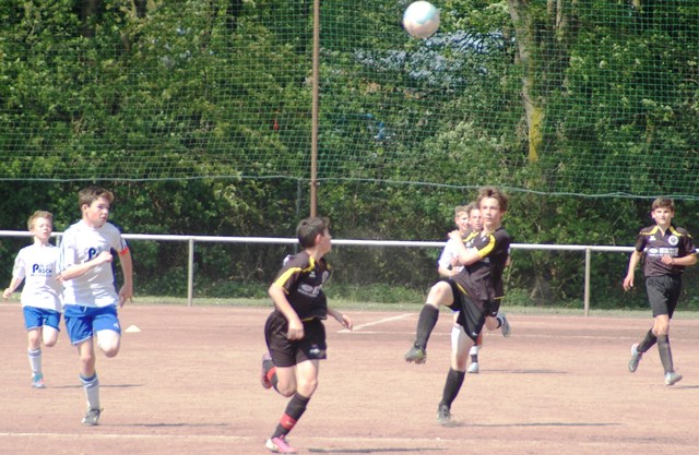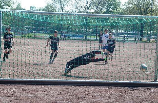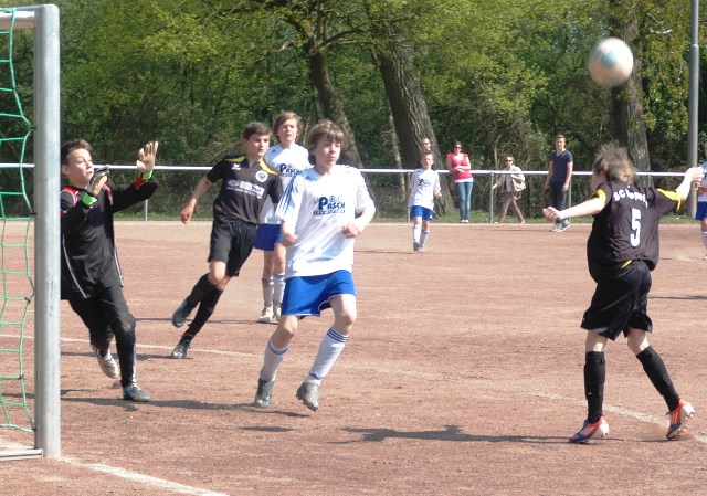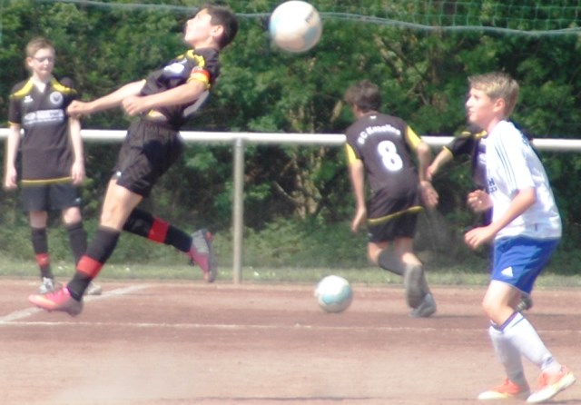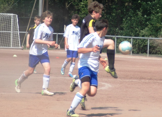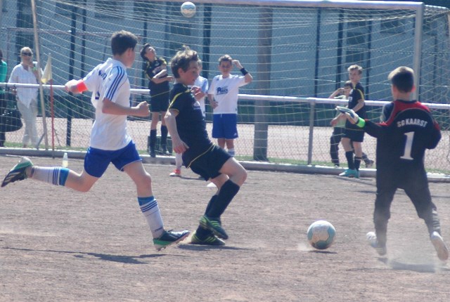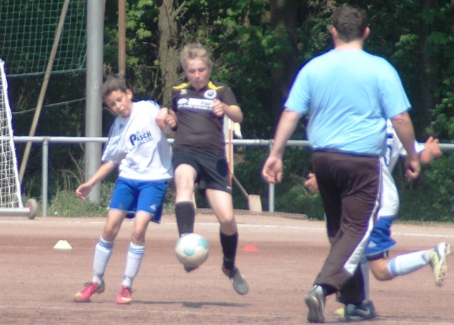 Am heutigen Samstag musste unsere D1 bei der SG Kaarst antreten. Wie schon der Spitzenreiter TuS Grevenbroich zwei Wochen vorher so seine Mühen mit den Kaarstern hatte und nur knapp 3 zu 2 gewann, so taten sich auch unsere Spieler als Tabellenzweiter lange sehr schwer mit der lauffreudigen und robusten Mannschaft auf einem heute sehr staubigen Aschenplatz. Von Anfang an war unser Team zwar immer dominat und versuchte Druck aufzubauen, aber die Kaarster stellten geschickt die Räume zu und erlaubten wenig ansehnliches und Gefahr bringendes Kombinationsspiel. Die Chancen für die Unseren entstanden daher meist nur nach Abwehrfehlern der Kaarster oder durch starke Einzelaktionen. So schaltete Cedric in der 7. Minute schnell und ging in das Passspiel der Kaarster Abwehr, aber sein Schuss ging knapp links am Tor vorbei. Auch Michael hatte kein Glück, als er ein Rückspiel erlief und versuchte, den Ball über den Torwart zu lupfen. Einen gewaltigen Schuss aus etwa 20 Metern Entfernung von Geburtstagskind Kolja lenkte der Torwart nur mit größter Mühe mit einer Hand zur Ecke und nach einem mal schnell gespielten Angriff über links von Niklas schoss Baran nur in die Arme des Torwartes. Hätte Baran ein paar Minuten vorher vielleicht auf einen der beiden mitgelaufenen und frei stehenden Mitspieler gepasst, anstatt es selber zu versuchen, vielleicht wäre man dann doch mit einer Führung in die Halbzeitpause gegangen. So aber stand es nach 30 Minuten nur 0 zu 0 unentschieden, das aber auch unser Torwart Lukas festgehalten hat, denn die Kaarster hatten gerade in der Anfangsphase die große Möglichkeit in Führung zu gehen. Lukas allerdings konnte diese aber durch eine Parade mit dem rechten Knie gerade noch vereiteln. Auch später überzeugte er durch gutes Stellungsspiel, wie zum Beispiel bei einem langen Ball, als er aus dem eigenen Strafraum herauslief und vor einem Kaarster Stürmer mit dem Kopf klärte.