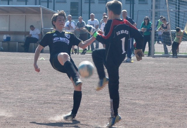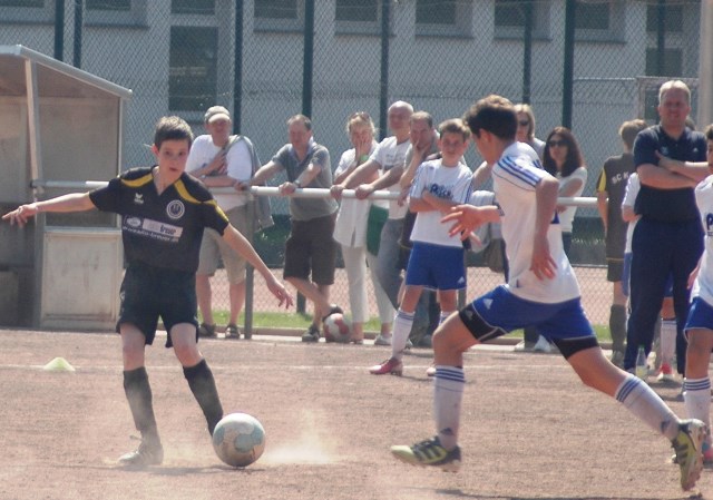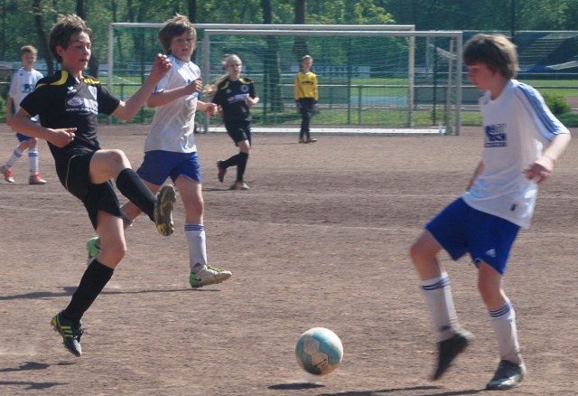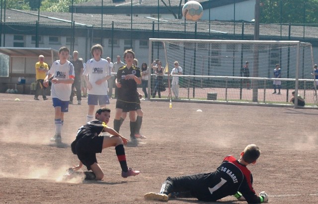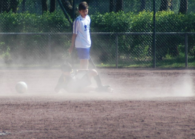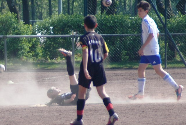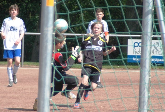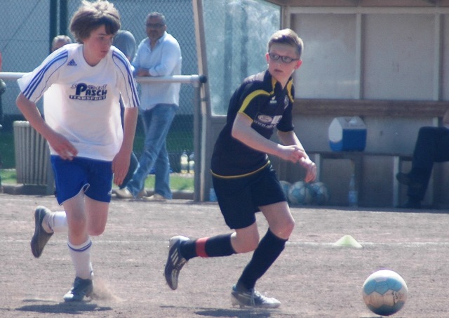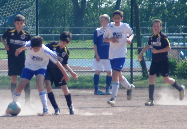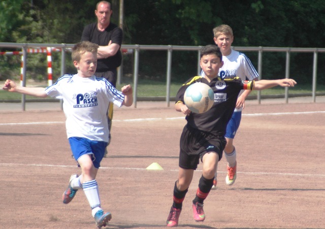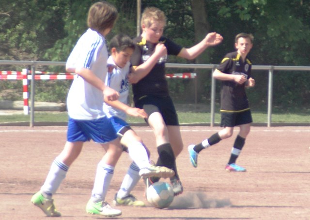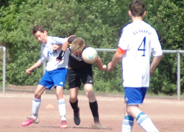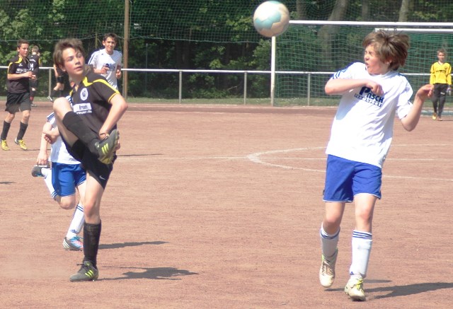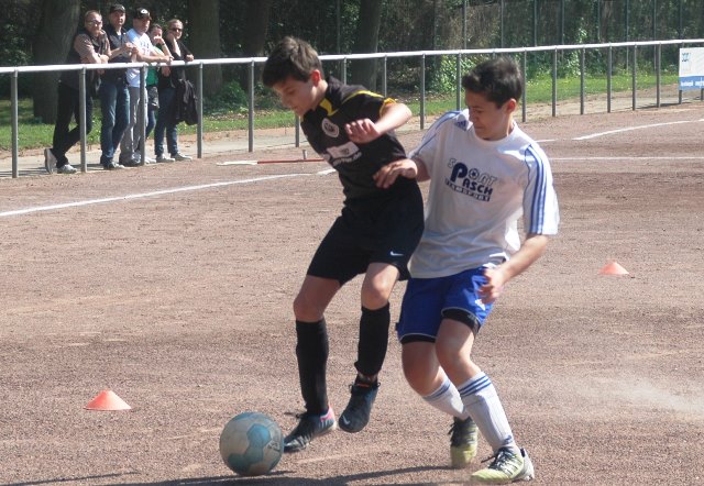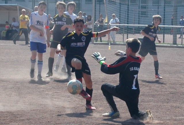 Am heutigen Samstag musste unsere D1 bei der SG Kaarst antreten. Wie schon der Spitzenreiter TuS Grevenbroich zwei Wochen vorher so seine Mühen mit den Kaarstern hatte und nur knapp 3 zu 2 gewann, so taten sich auch unsere Spieler als Tabellenzweiter lange sehr schwer mit der lauffreudigen und robusten Mannschaft auf einem heute sehr staubigen Aschenplatz. Von Anfang an war unser Team zwar immer dominat und versuchte Druck aufzubauen, aber die Kaarster stellten geschickt die Räume zu und erlaubten wenig ansehnliches und Gefahr bringendes Kombinationsspiel. Die Chancen für die Unseren entstanden daher meist nur nach Abwehrfehlern der Kaarster oder durch starke Einzelaktionen. So schaltete Cedric in der 7. Minute schnell und ging in das Passspiel der Kaarster Abwehr, aber sein Schuss ging knapp links am Tor vorbei. Auch Michael hatte kein Glück, als er ein Rückspiel erlief und versuchte, den Ball über den Torwart zu lupfen. Einen gewaltigen Schuss aus etwa 20 Metern Entfernung von Geburtstagskind Kolja lenkte der Torwart nur mit größter Mühe mit einer Hand zur Ecke und nach einem mal schnell gespielten Angriff über links von Niklas schoss Baran nur in die Arme des Torwartes. Hätte Baran ein paar Minuten vorher vielleicht auf einen der beiden mitgelaufenen und frei stehenden Mitspieler gepasst, anstatt es selber zu versuchen, vielleicht wäre man dann doch mit einer Führung in die Halbzeitpause gegangen. So aber stand es nach 30 Minuten nur 0 zu 0 unentschieden, das aber auch unser Torwart Lukas festgehalten hat, denn die Kaarster hatten gerade in der Anfangsphase die große Möglichkeit in Führung zu gehen. Lukas allerdings konnte diese aber durch eine Parade mit dem rechten Knie gerade noch vereiteln. Auch später überzeugte er durch gutes Stellungsspiel, wie zum Beispiel bei einem langen Ball, als er aus dem eigenen Strafraum herauslief und vor einem Kaarster Stürmer mit dem Kopf klärte.