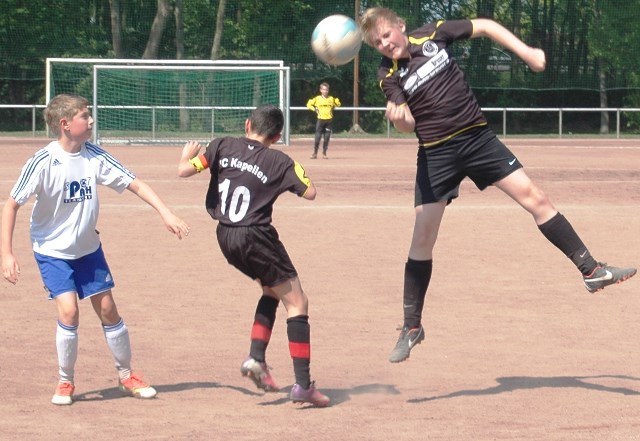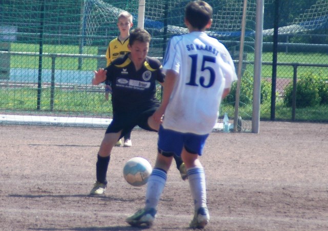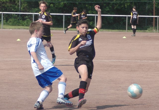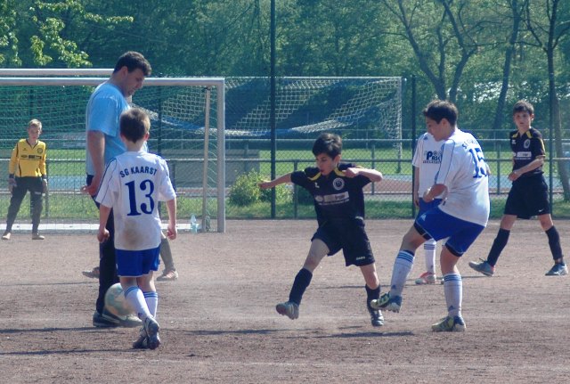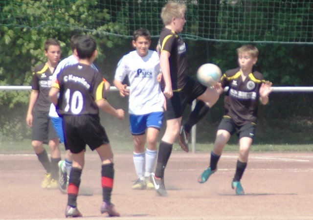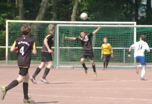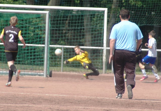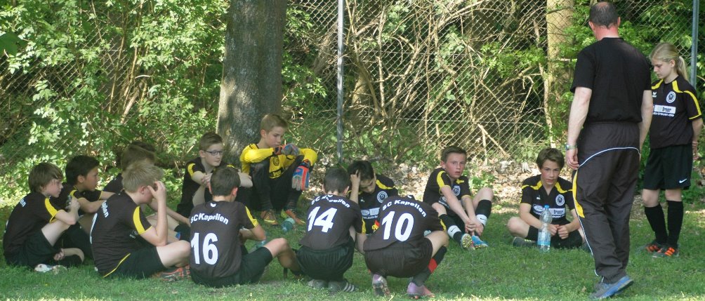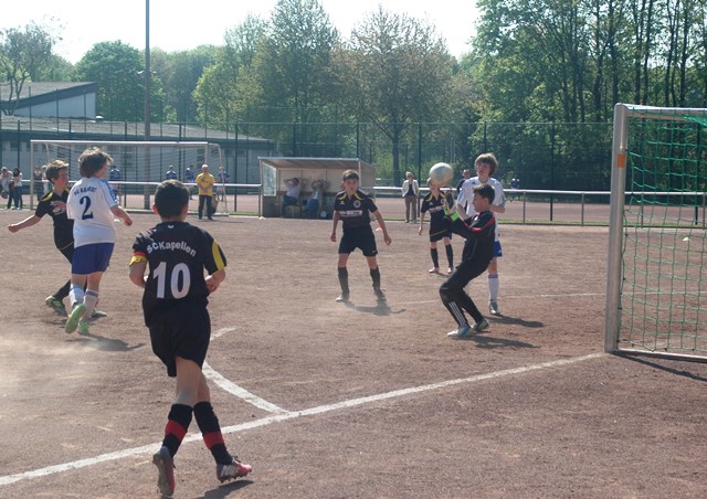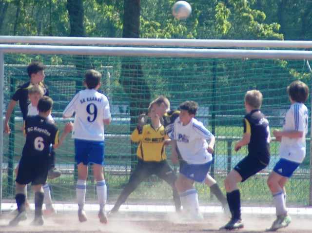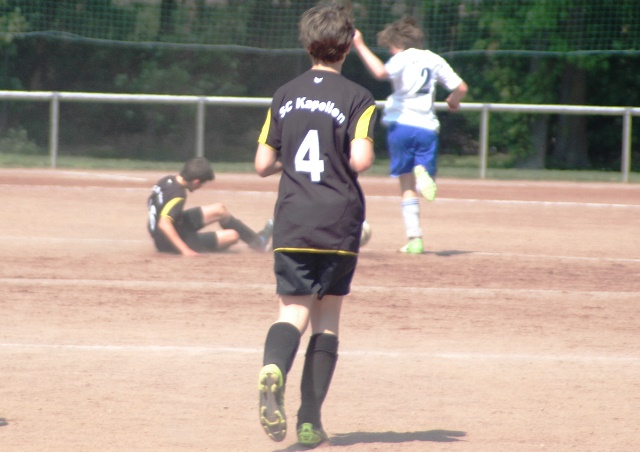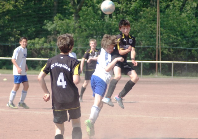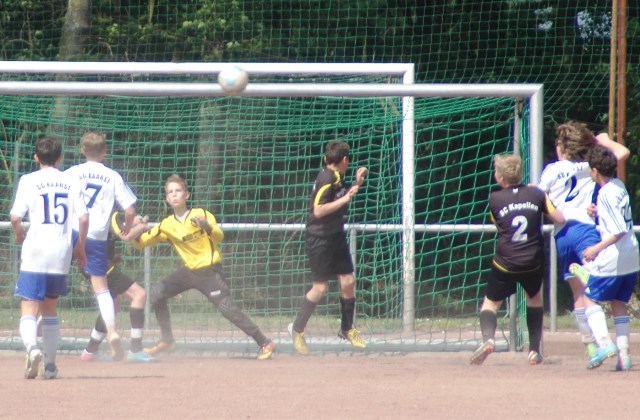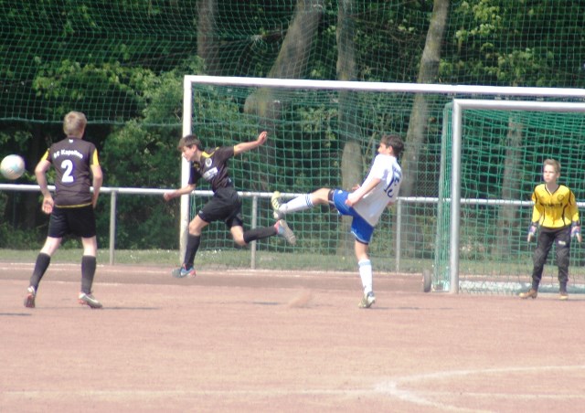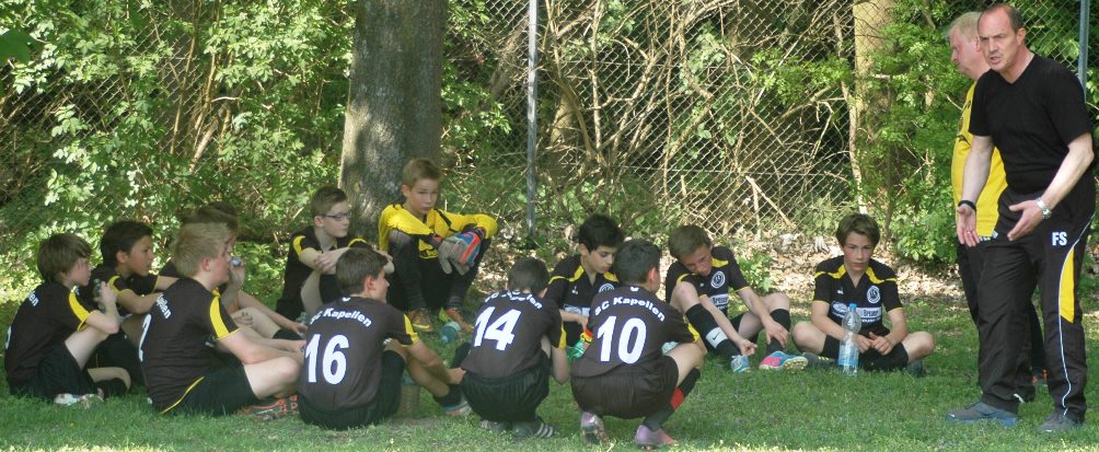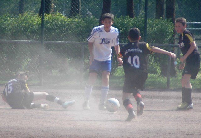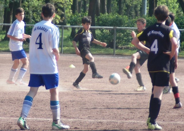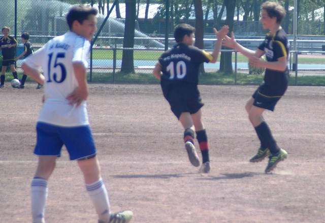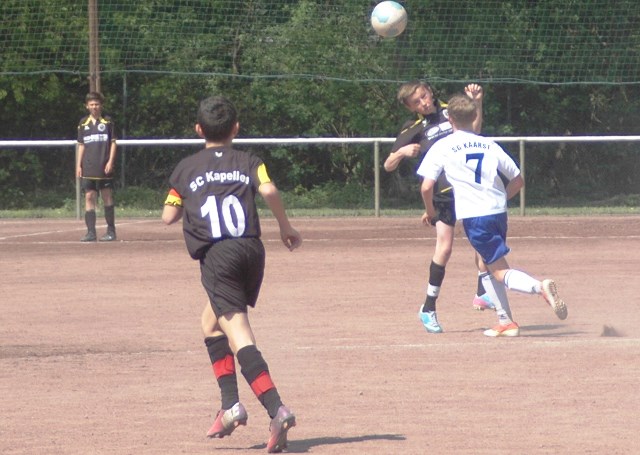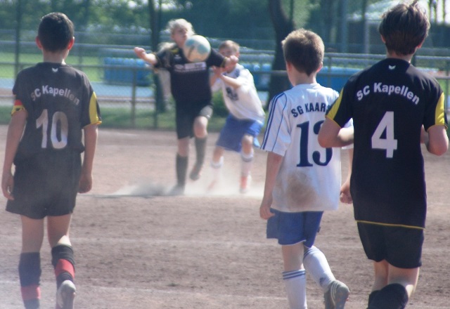Hoch motiviert und konzentriert ging die Mannschaft von Juppi Schmitz und Arnold Gaida nach deren deutlichen Pausenansprache in den zweiten Durchgang. Zwar gehörte den Kaarstern die erste Chance, aber erneut parierte Lukas mit dem Knie. Die anschließende Ecke fing er souverän ab und leitete den schnellen Gegenangriff ein. Über Benni und Baran gelangte der Ball zu Cedric, der sich gegen zwei Verteidiger durchsetzen konnte und am machtlosen Torhüter endlich zur viel umjubelten Führung einnetzen konnte. Nun war der Bann gebrochen, denn nur zwei Minuten später erhöhte erneut Cedric auf 2 zu 0, nachdem Baran am guten Kaarster Schlussmann gescheitert war. Kaarst musste nun offener nach vorne spielen und Kapellen bedankte sich. Nach einem genial genauen Pass von Dimitrij in den Lauf von Baran wurde dieser vom herauseilenden Torhüter im Strafraum gefoult. Den anschließenden Elfmeter verwandelte der Passgeber Dimitrij sicher zum 3 zu 0. Baran erhöhte nur wenige Minuten später nach klugem Zuspiel von Cedric auf den Endstand von 4 zu 0. In den letzten 20 Minuten passiert dann wenig. Kapellen wechselte durch und drosselte bei sommerlichen Temperaturen das Tempo. Kaarst war gefrustet und gab auf.
